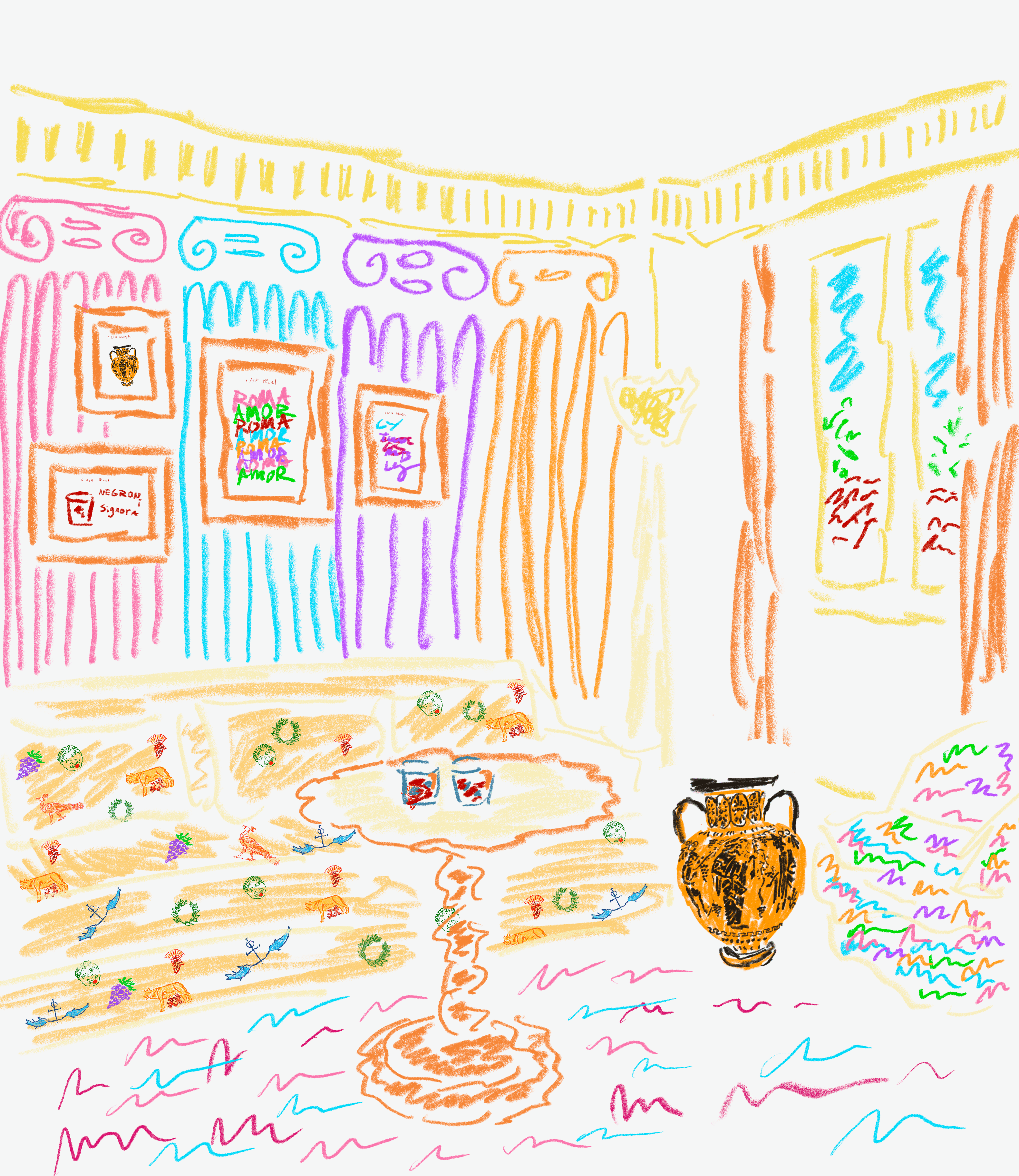 Through this new residency, drawings and paintings will unfold across both paper and textiles, woven into the very fabric of the room. Custom wall panels will anchor the space, while exclusively designed patterns extend across upholstery and decorative elements, binding structure and surface into a singular vision.